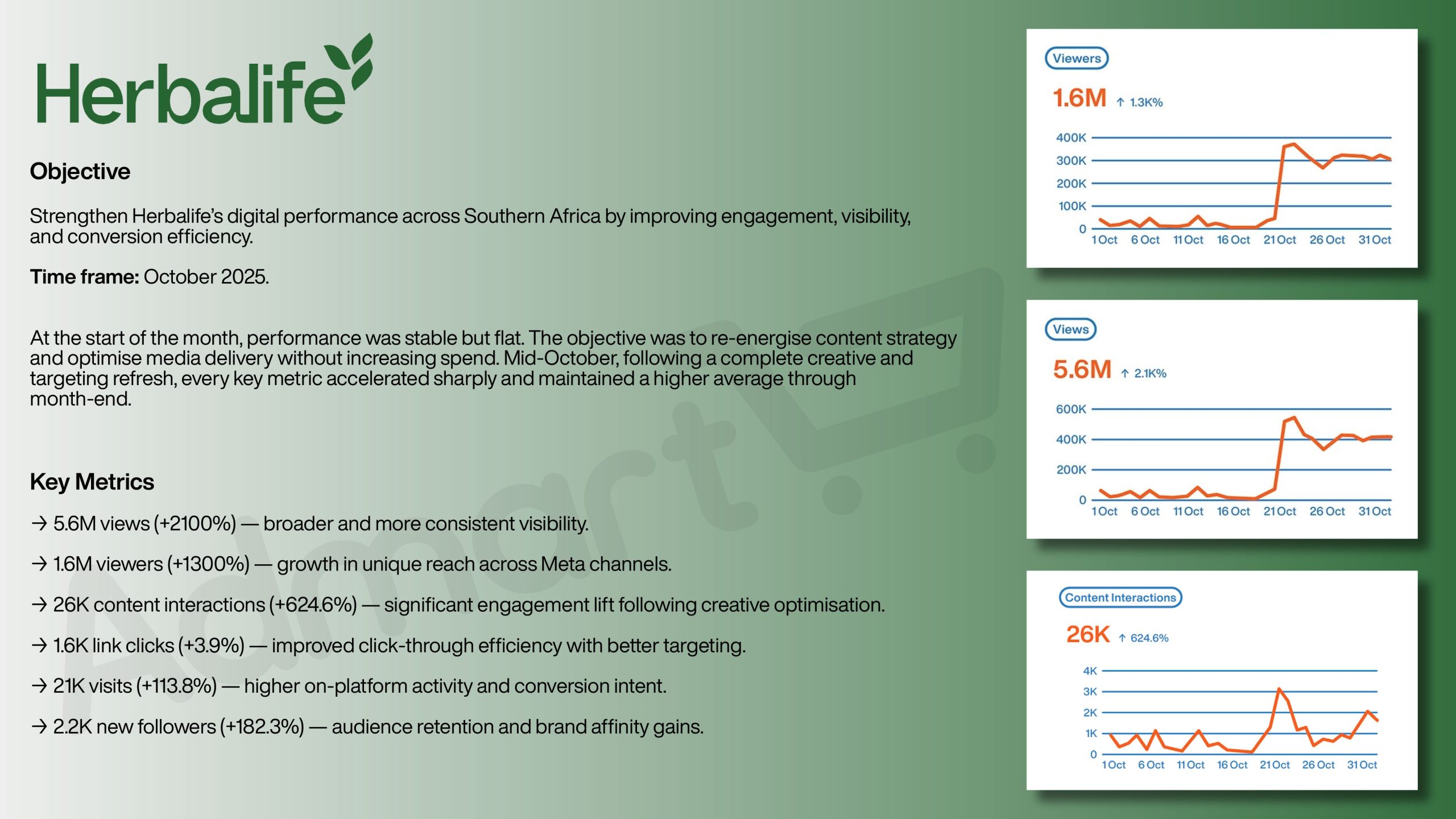 Where results come to life. We turn data into direction. Our performance team translates every click, conversion, and trend into clear actions that move your brand forward. From audience insights to budget pacing and attribution, we optimise what matters. Making sure every rand works harder. Transparent reporting and real-time insights keep you informed as performance continues to improve.